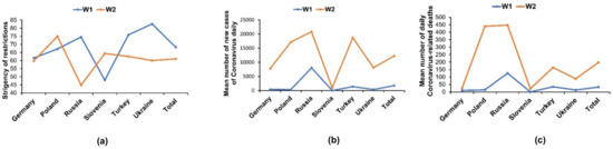Figures present the following data in six countries (Germany, Poland, Russia, Slovenia, Ukraine, and Turkey) during the first (W1) and the second (W2) wave of the COVID-19 pandemic: (a) stringency of restrictions; (b) mean number of new daily cases of COVID-19; (c) mean number of new daily COVID-19-related deaths.