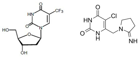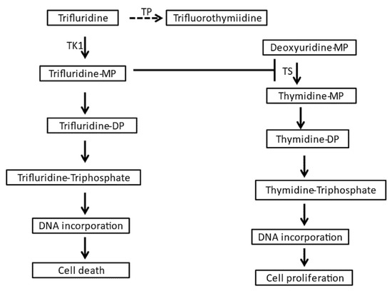 - Temmink, O.H.; De Bruin, M.; Comijn, E.M.; Fukushima, M.; Peters, G.J. Determinants of trifluorothymidine sensitivity and metabolism in colon and lung cancer cells. Anti-Cancer Drugs 2005, 16, 285–292. [Google Scholar] [CrossRef]