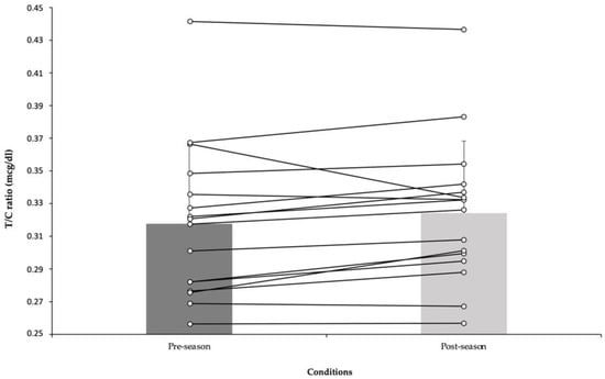 At this point, testosterone/cortisol ratio (T/C ratio) was calculated. In fact, the T/C ratio has been considered as an important physiologicaal variable to gauge individual condition and responses. In this sense, a t-test with data form the T/C ratio showed the same values before (0.317 ± 0.05) and after (0.324 ± 0.04) pre-season period [t(25) = 2.13, p = 0.07, d = 0]. Testosterone/cortisol ratio over the period can be found in Figure 1.