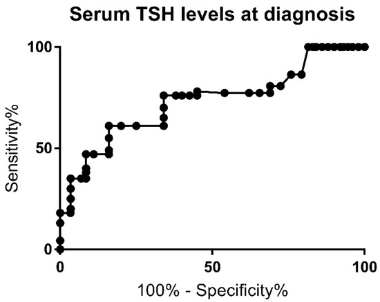 The ROC curve for TSH serum levels at diagnosis is represented in Figure 1. The area under the curve (AUC) was 0.8 (p = 0.0002).