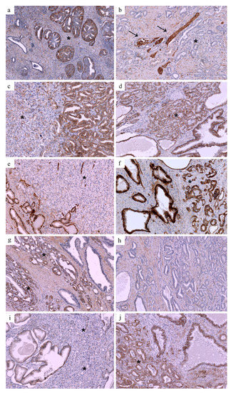 Examples of TFR, e-cadherin, and CD49 immunoreactivity in PCa. (a) High-grade PCa with positive TFR expression (marked with asterix); benign prostate glands are visible on the left and serve as internal negative control. (b) Low-grade PCa with negative TFR expression; TFR-positive nerve bundles are visible in the center and serve as internal positive control (marked with arrows, cancer cells marked with asterix). (c) PCa with NI and reduced e-cadherin expression in high-grade cancer glands on the left (marked with asterix) and normal expression in low-grade cancer glands on the right. (d) PCa with no NI and normal e-cadherin expression (marked with asterix). (e) PCa with reduced CD49 expression (marked with asterix); benign prostate glands are visible on the left and serve as internal positive control. (f) PCa with normal CD49 expression (marked with asterix). (g) PCa with EPE and positive TFR expression (marked with asterix); benign prostate glands are visible on the right and serve as internal negative control. (h) PCa confined to prostate and negative TFR. (i) PCa with EPE and reduced e-cadherin expression in cancer glands on the right (marked with asterix) and normal expression in benign glands on the left. (j) PCa confined to prostate with normal e-cadherin expression (marked with asterix). Original magnification in photomicrograph (a): 40×, in photomicrographs (b–j): 100×.