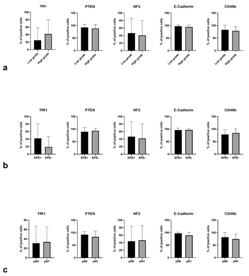 Quantitative (% of positive cells) TfR1, PTEN, NF2, e-cadherin, and CD49b immunoreactivity in (a) low-grade vs. high-grade PCa, (b) EPE+ vs. EPE- PCa, (c) pN0 vs. pN1 PCa. EPE—extraprostatic extension; PCa—prostate cancer; pN0—no nodal involvement; pN1—nodal involvement; TfR1—transferrin receptor 1; PTEN—Phosphatase and tensin homolog; NF2—neurofibromin 2; CD49b—integrin alpha-2.