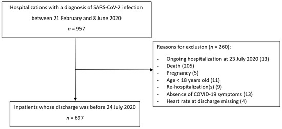 Figure 1 showed the flow-chart of enrolled patients. Starting from 957 hospitalizations in our hospital from 21 February 2020 to 8 June 2020. 260 were excluded with a final sample of 697 subjects. Reason for exclusion were: hospitalization before February 21st (n = 5), ongoing hospitalization at July 23th (n = 13), death (n = 205), pregnancy (n = 5), age < 18 years (11), hospitalization following the index one (n = 9), absence of SARS-CoV-2 related symptoms (n = 13) and missing value of the heart rate at discharge (n = 4).