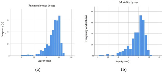 Number of cases of pneumonia (a) and mortality (b) frequency distributed by age.