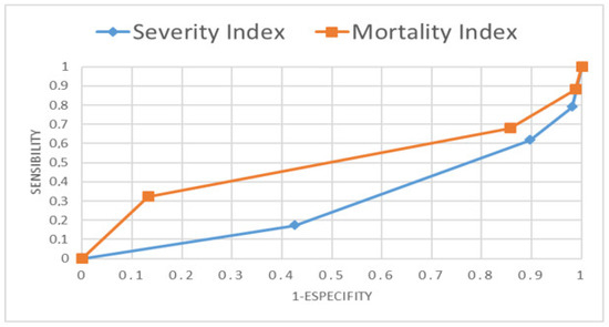 ROC curves of the severity and mortality index as a predictive factor for the occurrence of death.