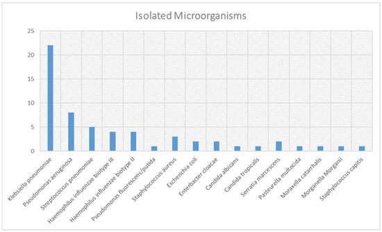 At only 59 of the individuals the agents causing pneumonia were isolated, which constitutes 2.42% of the total sample. At 39.28% (n = 22) of these isolations the Gram-negative pathogen Klebsiella pneumoniae was identified (Figure 3). Pseudomonas aeruginosa (n = 8) was the second most frequently isolated microorganism.