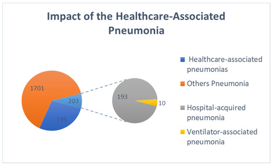 Impact of Healthcare-Associated Pneumonia. This figure represents the number of individuals with HCAP, HAP and VAP, in relation to the total number of individuals admitted for pneumonia.