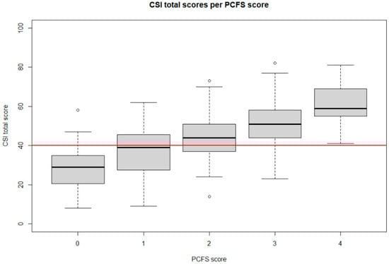 Boxplot of total score on the CSI by PCFS Scale score for all respondents. The red line is presents the cut-off value of the CSI at 40/100 to denote a person as having symptoms of central sensitisation. Abbreviations. CSI: Central Sensitization Inventory, PCFS: Post-COVID-19 Functional Status Scale.