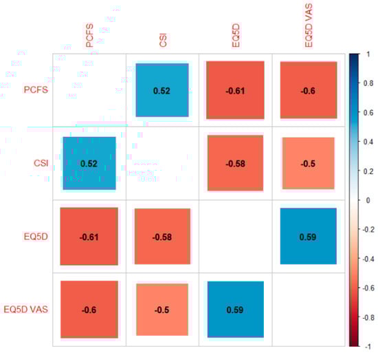 A significant positive correlation was revealed between PCFS Scale scores and CSI scores (r = 0.52, 95% CI from 0.45 to 0.58, p < 0.001). Statistically significant negative correlations were revealed between CSI scores and EQ5D scores (r = −0.58, 95% CI from −0.51 to −0.63, p < 0.001), CSI scores and EQ5D VAS scores (r = −0.50, 95% CI from −0.43 to −0.56, p < 0.001) and PCFS Scale scores and EQ5D scores (r = −0.61, 95% CI from −0.56 to −0.67, p < 0.001) (Figure 2).