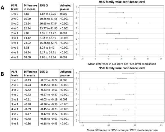 Based on a One-way ANOVA testing, there was a significant effect of PCFS group level on the total CSI score at the 5% level (F(4,486) = 46.17, p < 0.001). Post hoc comparison using the Tukey HSD test indicated that mean score for the PCFS group 0 was significantly lower than for PCFS 1 group (mean difference of 8.82 (95% CI from 1.87 to 15.76), p = 0.005). Additionally, the mean difference in CSI score between PCFS groups 1 and 2 (mean difference of 7.09 (95% CI from 1.95 to 12.22), p = 0.002), groups 2 and 3 (mean difference of 6.33 (95% CI from 3.24 to 9.42), p < 0.001), and groups 3 and 4 (mean difference of 10.60 (95% CI from 2.86 to 18.34), p = 0.002) were statistically significant. Similarly, there was a significant effect of PCFS group level on the EQ5D score at the 5% (F(4,499) = 83.41, p < 0.001). Post hoc comparison using the Tukey HSD test indicated a statistically significant difference in EQ5D scores for all level comparisons of the PCFS Scale. All post hoc tests can be found in Figure 3.