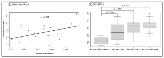 Correlational analysis was performed between PaO2/FiO2-NEGBAL and NEGBAL accumulated; the results were statistically significant (p = 0.034) (Figure 1A).