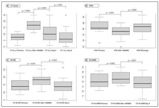 CT score evolution pre- and post-NEGBAL of CT, HTO, Ø SVC, and Ø CARD. (A) Box plot for CT score previous to NEGBAL, CT score adm. NEGBAL, CT day 4, and CT day 8. (B) Box plot for previous HTO, HTO adm. NEGBAL, and HTO day 4. (C) Box plot for Ø SVC previous NEGBAL, Ø SVC adm. NEGBAL, and Ø SVC day 4. (D) Box plot for Ø CARD previous NEGBAL, Ø CARD adm. NEGBAL, and Ø CARD day 4.