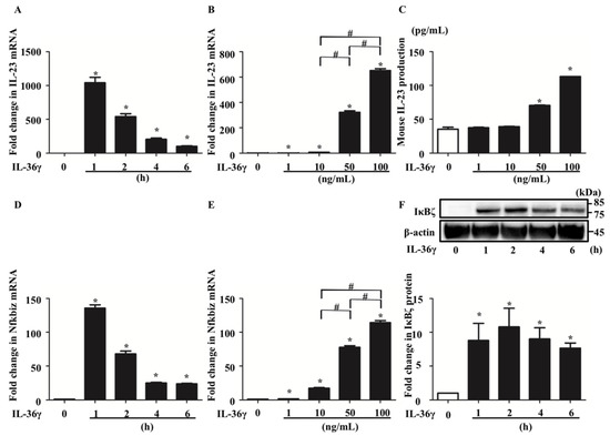 IL-36γ stimulation upregulated IL-23 and Nfkbiz in bone marrow-derived dendtitic cells (BMDCs). (A,D,F) BMDCs were stimulated with IL-36γ (100 ng/mL) for 1, 2, 4, or 6 h. (A,D) Quantitative reverse transcription (qRT)-PCR. (F) Western blotting. IκBζ protein levels are normalized to β-actin protein levels using ImageJ and expressed as fold change. (B,C,E) BMDCs were stimulated with IL-36γ (1, 10, 50, or 100 ng/mL) for 1 h. (B,C) qRT-PCR. (E) BMDCs were stimulated with IL-36γ (100 ng/mL) for 24 h, and IL-23 production in the culture supernatant was measured by ELISA. (A–D) Data are expressed as the mean ± standard error of the mean (SEM); n = 3/group. * Significant differences between the IL-36γ-stimulated groups and control groups (p < 0.05). # Significant differences between the IL-36γ-stimulated groups of each dose (p < 0.05). mRNA levels normalized for Ywhaz expression were expressed as the fold change compared to that in the control group. (C) Data are expressed as the mean ± SEM; n = 3/group; * p < 0.05. (F) Data are representative of experiments repeated three times with similar results.