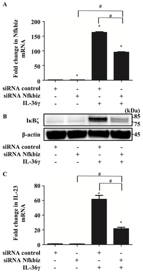IκBζ is likely an integral part of IL-36γ-induced IL-23 upregulation in BMDCs. Control small interfering RNA (siRNA)- or Nfkbiz siRNA-transfected BMDCs were treated with/without IL-36γ (10 ng/mL) for 1 h and analyzed via quantitative reverse transcription (qRT)-PCR and Western blotting. +/− indicates whether siRNA or IL-36γ is utilized. (A) qRT-PCR. (B) Western blotting. (C) qRT-PCR. (A,C) Data are expressed as the mean ± standard error of the mean (SEM); n = 3/group. * Significant difference versus the control siRNA-transfected group with no IL-36γ stimulation (p < 0.05). # Significant difference between the Nfkbiz siRNA-transfected and control siRNA-transfected groups that were stimulated with IL-36γ (p < 0.05). mRNA levels normalized to Ywhaz mRNA expression are expressed as the fold change versus that in the control group. (B) IκBζ expression was evaluated using anti-murine IκBζ antibody. Data are representative of experiments repeated three times with similar results.