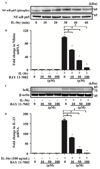 Next, we examined the mechanism by which IL-36γ upregulates Nfkbiz expression in murine BMDCs. Considering that IL-36 binding to the IL-36 receptor complex leads to the recruitment of MyD88 and activation of NF-κB signaling [16] and that Nfkbiz expression is regulated by phosphorylation of p65, a component of the NF-κB heterodimer [24], we hypothesized that IL-36γ modulated Nfkbiz expression via NF-κB signaling in murine BMDCs. We analyzed p65 phosphorylation in murine BMDCs stimulated with IL-36γ (100 ng/mL) for 10, 20, 30, 40, or 60 min using Western blotting. We confirmed that p65 phosphorylation was induced after 10 min of IL-36γ stimulation (Figure 3A). We further examined whether BAY 11-7082, an inhibitor of p65 phosphorylation, affects the upregulation of Nfkbiz induced by IL-36γ stimulation. We stimulated murine BMDCs with IL-36γ (100 ng/mL) for 1 h in the absence or presence of BAY 11-7082 (10, 50, or 100 μM) and measured Nfkbiz mRNA and IκBζ protein expression by qRT-PCR (Figure 3B) and Western blotting (Figure 3C), respectively. BAY 11-7082 treatment inhibited Nfkbiz upregulation in a concentration-dependent manner (Figure 3B,C). Moreover, we examined whether BAY 11-7082 treatment inhibits the upregulation of IL-23 induced by IL-36γ. We measured IL-23 production in the culture supernatant of BMDCs stimulated with IL-36γ (100 ng/mL) for 24 h in the absence or presence of BAY 11-7082 (10, 50, or 100 μM) using ELISA. BAY 11-7082 treatment also inhibited the upregulation of IL-23 induced by IL-36γ stimulation in a concentration-dependent manner (Figure 3D).
