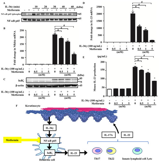 Metformin treatment inhibited IL-36γ-induced upregulation of Nfkbiz and IL-23 by modulating NF-κB signaling in BMDCs. BMDCs stimulated with IL-36γ (100 ng/mL) for 10, 20, 30, 40, or 60 min in the absence or presence of metformin (5 mM) (A). (A) Western blotting. BMDCs were stimulated with/without IL-36γ (100 ng/mL) for 1 h (+/−) in the absence or presence of metformin (0.5, 1, or 5 mM). (B,D,E). (B,D) quantitative reverse transcription-PCR. (E) ELISA. (F) Graphical abstract. Data are expressed as the mean ± standard error of the mean; n = 3/group. * Significant difference between the IL-36γ-stimulated and control groups (p < 0.05). # Significant differences between the metformin-treated and control groups that were stimulated with IL-36γ (p < 0.05). mRNA levels normalized for Ywhaz expression were expressed as fold changes versus that in the control group. (A,C) Data are representative of experiments repeated three times with similar results. +/− indicates whether IL-36γ or metformin is utilized.