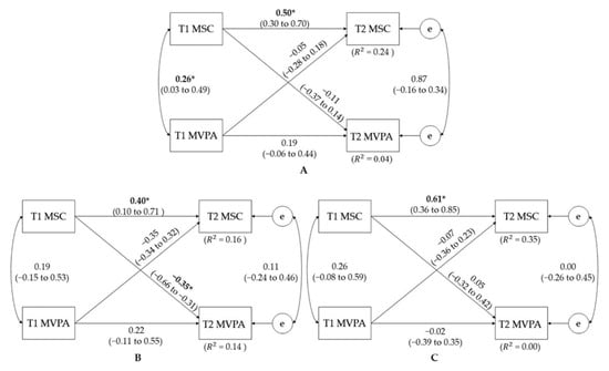 Cross-lagged model of the bidirectional relationships between MSC and total MVPA time before and after the 8-week study period for (A) total, (B) girls, and (C) boys. T1—baseline time; T2—follow-up time; e—error; R2 = coefficients of determination; MSC—motor skill competence; MVPA—moderate-to-vigorous physical activity. Path coefficients are standardized with 95% confidence intervals. * denotes a statistically significant path coefficient with p < 0.05.