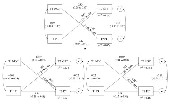 Cross-lagged model of the bidirectional relationships between MSC and PC before and after the 8-week study period for (A) total, (B) girls, and (C) boys. T1—baseline time; T2—follow-up time; PC—perceived competence. Path coefficients are standardized with 95% confidence intervals. * denotes a statistically significant path coefficient with p < 0.05.
