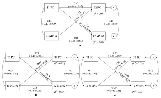 Cross-lagged model of the bidirectional relationships between PC and total MVPA time before and after the 8-week study period for (A) total, (B) girls, and (C) boys. T1—baseline time; T2—follow-up time; MVPA—moderate-to-vigorous physical activity. Path coefficients are standardized with 95% confidence intervals. * denotes a statistically significant path coefficient with p < 0.05.