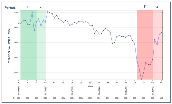 Median activity of the entire population during the study period. Legend: Period 1 = Lockdown control period (year 2019); Period 2 = Post-lockdown control period (year 2019); Period 3 = Lockdown period (year 2020); Period 4 = Post-lockdown period (year 2020). For the temporal definition of the three periods, please see the Methods section; p < 0.0001 for mean period 3 vs. mean period 1, mean period 3 vs. mean period 4, mean period 2 vs. mean period 4; p = 0.0162 mean period 1 vs. mean period 2.