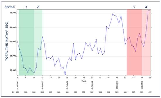 Total time in AT/AF of the entire population during the study period. Legend: Period 1 = Lockdown control period (year 2019); Period 2 = Post-lockdown control period (year 2019); Period 3 = Lockdown period (year 2020); Period 4 = Post-lockdown period (year 2020). For the temporal definition of the three periods please see the Methods section; AT/AF = atrial tachycardia/atrial fibrillation; p = 0.0150 for mean period 3 vs. mean period 1; p = N.S. for all other comparisons.