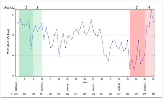 Median heart rate variability of the entire population during the study period. Legend: Period 1 = Lockdown control period (year 2019); Period 2 = Post-lockdown control period (year 2019); Period 3 = Lockdown period (year 2020); Period 4 = Post-lockdown period (year 2020). For the temporal definition of the three periods please see the Methods section; HRV = heart rate variability; p < 0.0001 for mean period 3 vs. mean period 1, mean period 3 vs. mean period 4; p = 0.0018 for mean period 1 vs. mean period 2; p = N.S. for all other comparisons.