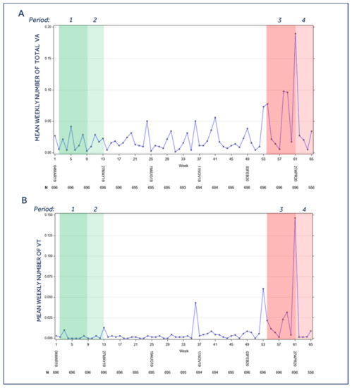 Burden of ventricular arrhythmias of the entire population during the study period. (A). Mean weekly number of ventricular arrhythmias (VT monitor, VT, FVT and VF); (B) Mean weekly number of ventricular tachycardias (VT). end: Period 1 = Lockdown control period (year 2019); Period 2 = Post-lockdown control period (year 2019); Period 3 = Lockdown period (year 2020); Period 4 = Post-lockdown period (year 2020). For the temporal definition of the three periods please see the Methods section; VA = ventricular arrhythmias; VT = ventricular tachycardias; (A): p = 0.026 for mean period 3 vs. mean period 1; p = 0.0338 for mean period 3 vs. mean period 4; p = N.S. for all other comparisons. (B): p = 0.024 for mean period 3 vs. mean period 1; p = 0.0035 for mean period 3 vs. mean period 4; p = N.S. for all other comparisons.