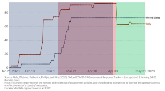 Evaluation of restricting policies in the U.S. and Italy during the observation periods analyzed by O’Shea et al. (blue shaded) and in our analysis (red-shaded area is the lockdown period, and the green-shaded area is the post-lockdown period). The y-axis reports a composite measure based on nine response indicators including school closures, workplace closures, and travel bans, rescaled to a value from 0 to 100 (100 = strictest) (for additional information, see https://ourworldindata.org/grapher/covid-stringency-index?tab=chart, accessed on 2 January 2021).