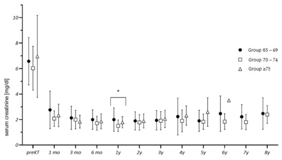 The present retrospective clinical study included 85 patients aged ≥65 years who received a deceased donor kidney transplant from donors ≥65 years allocated through ESP. Recipients were divided into three groups with respect to their age at the time of KT in years as following: Group 65–69, Group 70–74, and Group ≥75. The KTs were conducted by experienced urologic transplant surgeons between January 2010 and July 2018 at the Charité-Universitätsmedizin Berlin. All patients received a renal allograft for the first time and were followed up until death or the end of study (26 May 2020). The immunosuppression protocol after KT was identical for all patients and consisted of tacrolimus, mycophenolate mofetil (MMF) and prednisolone.