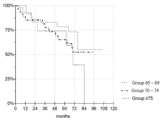 Kaplan–Meier survival plot demonstrating death-censored patient survival. There were no significant differences in the patient survival time between the groups (p = 0.149 for Gr. 7074, p = 0.438 for Gr. 75+).