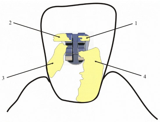 Schematic representation of the BBI: 1—plaque present on the bracket only; 2—plaque present on the bracket and the immediate adjacent tooth surface; 3—plaque present on the bracket and continuous to the interproximal surface; 4—a continuous layer of plaque extending from the bracket to the gingival margin.