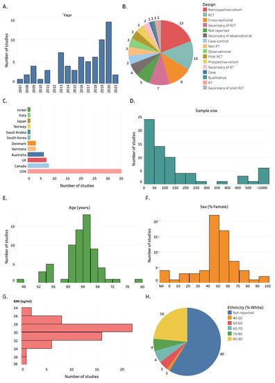 General study and population details. The number of studies by: (A) year of publication; (B) study design; (C) country; (D) sample size; (E) mean age; (F) percentage of female participants; (G) mean BMI; (H) percentage of participants of white ethnic background. Abbreviations: RCT, randomized controlled trial; RT, randomized trial; BMI, body mass index; NR, not reported. Interactive version of the figure with all the study references is located here: https://public.tableau.com/app/profile/tomasz.cudejko/viz/Figure2_16288559308710/Figure2 (accessed on 19 October 2021).