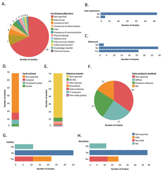 Details regarding facilitators and barriers to the feasibility of using wearable technology in a real-world setting in people with knee OA. The number of studies reported: (A) facilitators and barriers; (B) user experience; (C) adherence; (D) instructions provided to participants; (E) adverse events; (F) how data generated from wearable technology was analyzed; (G) validity; (H) reliability. Abbreviations: HCP, health care professional; NA, not applicable. KOA, knee osteoarthritis; AEs, adverse events; No, not reported; Yes, reported. Interactive version of the figure with all the study references is located here: https://public.tableau.com/app/profile/tomasz.cudejko/viz/Figure5_16328264416900/Figure5 (accessed on 19 October 2021).