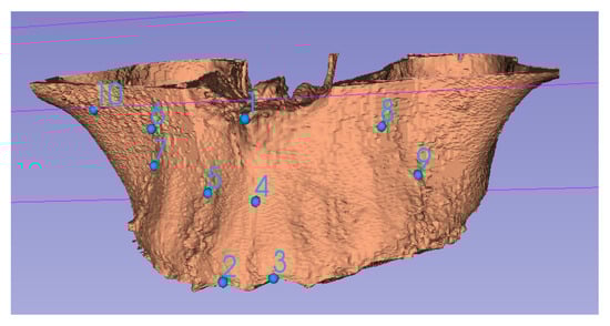 Segmentation of the midface with special attention on the maxilla and contiguous parts of the palatine bone, showing some homologous landmarks (1–10).