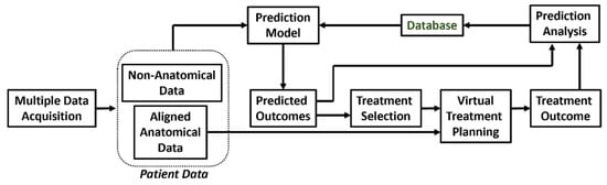 The above limitations of VSP in its current form are being realized and new approaches to prediction-based surgery planning are beginning to emerge. The schematic for prediction-based VSP is illustrated in Figure 5. The key difference of this scheme is that it has a closed loop architecture instead of the open loop architecture used for traditional VSP. Another major difference is that the decision for treatment selection, which is traditionally a part of the virtual diagnosis, and depends highly on the medical practitioner, is now assisted by the results of a predicted output model. The process starts with the acquisition of patient data from multiple sources. Similar to traditional VSP, these data are aligned to obtain a full scope of patient anatomy. However, in addition to anatomical information, non-anatomical data specific to the patient is also collected. The complete data (anatomical and non-anatomical) is then used by the prediction model to forecast the outcome of a selected treatment plan. Using this approach, patient-specific chances of success and the risks of various treatment options can be compared, by using the prediction model outcomes of alternative treatment plans. For fast-changing anatomies, prediction models using Bayesian statistics and Monte Carlo simulations can be used to accommodate changes in the anatomy associated with the time delay before surgery. In these cases, VSP and the development and manufacturing of patient-specific tools is performed, as performed traditionally. The final treatment outcome is then recorded and analyzed against the predicted outcomes of the selected treatment prediction model. Deviations of the actual outcome from the predicted model are calculated and recorded in a database. This database is then used for continuous improvement of the prediction model (Figure 5).