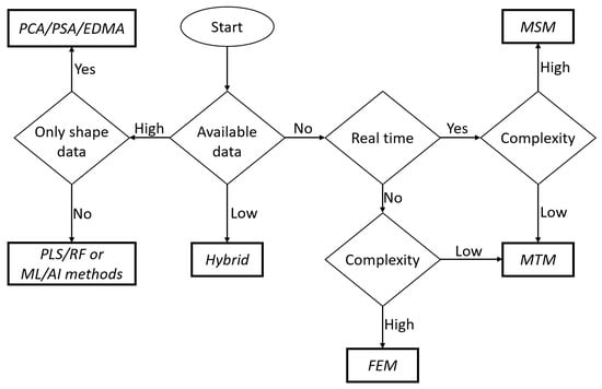 If the model-based method does not need to be solved in real time, then accuracy can be given priority over solving time. Therefore, for complex models the highly accurate FEM should be preferred. For low complexity, if the accuracy of MTM is comparable to that of FEM, MTM should be used to save VSP time. In addition, when considering data-based models, the final model selection depends on the type of data available. If only pre- and post-operative shape information is available, it is suggested to use statistical shape analyses, such as PCA and PSA. Furthermore, if the data contain other treatment- and/or patient-specific information, then a more complex mapping model, such as machine learning or artificial intelligence, can be used. These approaches are summarized in Figure 6.