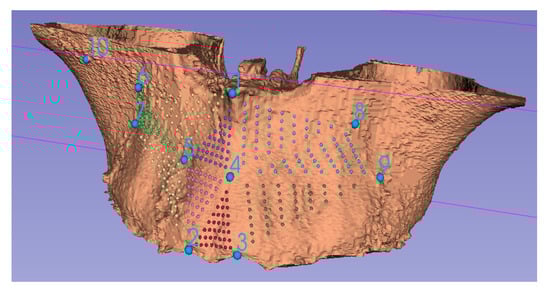 Using CBCT data, the maxillary complex has been rendered in 3D and the semi-landmarks (colored points) have been computed using the ten homologous landmarks (1–10).