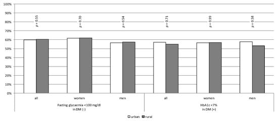 A proportion of 40% of patients (both in urban and rural areas) without diagnosed diabetes had elevated fasting glucose levels. More than 55% of diabetic patients achieved HbA1c < 7% (Figure 1).