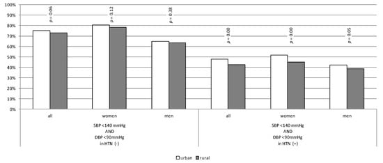 Roughly three quarters of patients without diagnosed hypertension had BP below 140/90 mmHg measured in the office. Forty-eight per cent of hypertensive patients in the urban population compared to 43% in the rural population achieved recommended BP targets (according to guidelines in force at the time the study was conducted) (p < 0.01). The differences were statistically significant in both genders (Figure 2). After analysing data in light of BP target values introduced by the 2018 ESH/ESC guidelines [] (published after the study period), we discovered that new treatment targets were achieved in approximately 5% of patients. Detailed data are presented in Figure S1.