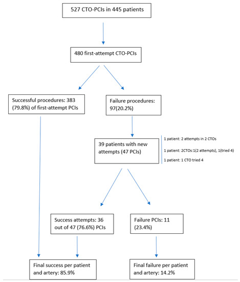 A total of 527 of CTO-PCIs in 445 patients between May 2007 and November 2020 were performed in our cath lab. The mean age of the entire cohort was 65.2 ± 10.9 years, and 446 (84.6%) were men. During the first period up to December 2012, the load of cases was low, with a total of 123 PCIs and from January 2013 to November 2020, and an average of 50 cases a year were performed in our institution. The level of inter-observer concordance for the estimation of J-CTO variables assessed by Kappa index was 0.8. A flowchart of the entire cohort comprising of the first-attempt and reattempt groups with the corresponding technical success is depicted in Figure 1. A total of 39 patients had repeated attempts on the same artery after failing the first procedure. In total, 1 out of 39 patients had two CTOs, each of them attempted twice. One patient had two CTOs, one of them was attempted twice and the other four times, and one patient had one CTO that was tried four times. The remaining patients had one CTO attempted twice. The overall repeated procedures were 47 PCIs. We found that 36 out of 47 (76.6%) reattempted CTO-PCIs were successful, resulting in an overall PCI success rate per patient and artery of 85.9% in the entire cohort. This signified that the overall success (taking into account the first and new attempted procedures) increased by 6.1% in the entire cohort.