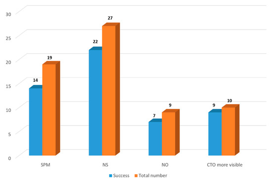 The analyses of 47 repeated procedures revealed that subintimal plaque modification (SPM) had been used in 19 cases during the previous attempts. In 14 out of 19, the procedure was successful. In 27 cases, a new strategy including new devices or techniques different to the previous procedures was used, and the new PCI was successful in 22 out of 27. Nine new procedures were performed by a new operator, of which seven were successful. Finally, in 10 new PCIs, the CTO route was more visible in comparison to the previous attempt, and in 9 of 10, the new attempt was successful (Figure 2).