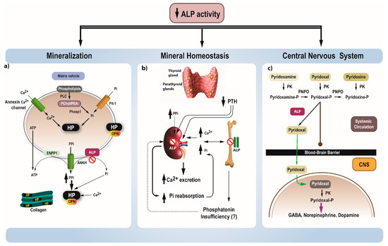 Concerning mineral homeostasis, in severe cases, reduced incorporation of minerals in the skeleton results in elevated calcium and Pi, which, in turn, leads to reduced PTH levels and hypercalciuria (Figure 1b). However, in less severe cases, mineral homeostasis is normal, apart from the mild elevation of Pi levels and hypercalciuria. Hyperphosphatemia in particular, is mainly attributed to increased renal reabsorption of phosphate (elevated tubular maximum reabsorption rate of phosphate to glomerular filtration rate (TmP/GFR)) [12]. Although the underlying mechanism is unknown, possible explanations include direct role of ALP in renal phosphate reabsorption, competition with excess PPi for the same transport mechanism and inappropriately normal or reduced levels of phosphatonins. Indeed, a recent study in patients with pediatric HPP confirmed the presence of hyperphosphatemia, which was not correlated with the disease severity, the elevated TmP/GFR along with inappropriately normal FGF23 and secreted Frizzled Related Protein 4 (sFRP4) levels, and low levels of fibroblast growth factor 7 (FGF7) [12].
