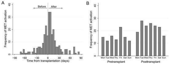 (A) The distribution of Medical Emergency Team (MET) activations relative to the day of transplantation (t = 0, vertical dashed line), showing that the peak occurrence of MET activation occurred in the first 7 days after liver transplantation. (B) The distribution of MET activation across the week in patients pre- and posttransplant.