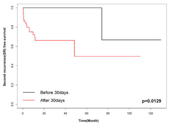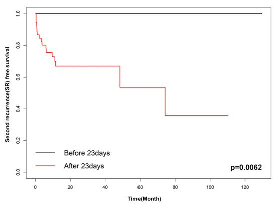 Factors associated with SR were evaluated using univariate analyses. These factors included age, bullae on a CT scan, a prior contralateral pneumothorax event before surgery, body-mass index, multiple wedge resection, pleurodesis, and late recurrence. In univariate analyses, body-mass index and late recurrence with p-values of less than 0.1 were included in the multivariable analysis. The multivariable Cox proportional hazard analysis showed only late recurrence as a significant factor for SR rate (HR 7.957 (95% CI 1.043–60.673), p = 0.045) (Table 3). Moreover, we analyzed the data to find the optimal cut-off point of SR-free survival; it was determined to be 30 days (p = 0.0206) based on the Contal method and 23 days (p = 0.0062) based on O’Quigley’s method. Figure 2 and Figure 3 show the Kaplan–Meier SR-free survival curves with two different cut-off values.