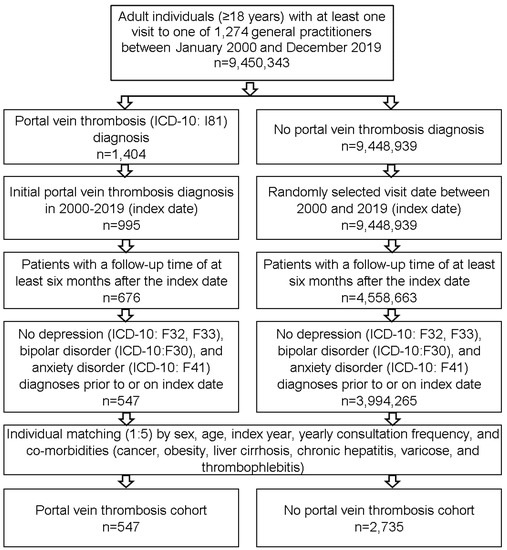 This study included adult (≥18 years) patients who received a first diagnosis of PVT (ICD–10: I81) in one of 1274 general practices in Germany between January 2000 and December 2019 (index date). Patients had to have a follow-up time of at least 6 months after the index date. Patients with depression (ICD–10: F32, F33), bipolar disorder (ICD–10: F30) and anxiety disorders (ICD–10: F41) diagnoses prior to or on the index date were excluded. After applying similar inclusion criteria, patients without PVT were matched to those with PVT. Greedy nearest-neighbor propensity score matching (1:5) based on sex, age, co-diagnoses documented within 12 months prior to the index date (cancer (ICD–10: C01–C97), obesity (ICD–10: C66), liver fibrosis and cirrhosis (ICD10: K70.3, K74) or chronic hepatitis (ICD10: K73), thrombophlebitis (ICD–10: I80) and varicose (ICD10: I83–I85)), and yearly consultation frequency was performed. Prior to the matching, these co-diagnoses were more frequently among patients with PVT, and were associated with depression risk in feasibility analyses. As PVT patients had a much higher general practitioner (GP) consultation frequency, and higher consultation frequency can increase the probability that outcome diagnoses (depression, anxiety disorders) will be documented, we included consultation frequency per year into the matching process.