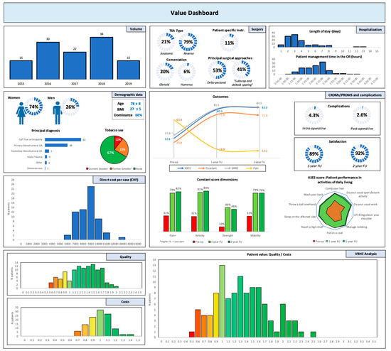 Evaluating the value of health care is of paramount importance to keep improving patients’ quality of life and optimizing associated costs. Hospitals’ digitalization is still ongoing and offers a great potential for patients’ evaluation along their entire care path. Beyond this, the real challenge that often arises in VBHC discussions is the absence of external benchmarks which compels us to compare our results within our institution or at different time intervals. The authors of the present study therefore created a new value-based dashboard for TSA, which allows an objective comparison with standard references.