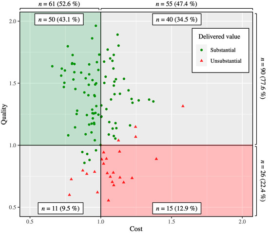 According to our results, 78% of the TSAs performed at our institution offered a substantial value to patients. It is worth noting that 41 patients (35%) had a substantial delivered value although they had either a quality of care below the expectations or an excessive direct cost (Figure 2). This emphasizes the importance of evaluating both indicators together rather than interpreting them independently from each other.