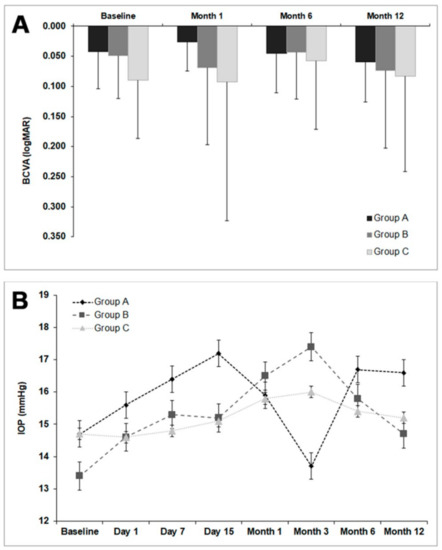 No changes in BCVA and IOP were observed between the baseline measurement and the end of each group’s follow-up (p > 0.05). Furthermore, there were no significant differences among the treatment groups for BVCA and IOP at any follow-up time (see Figure 2). The IOP was maintained between 13 and 18 mmHg during follow-up in the three groups.