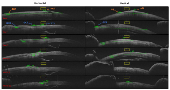 OCT graft measurements (µm) for mPRGF. Basal: TL: thickness of the limbus, HS: horizontal size, THS: total horizontal size, and VS: vertical size. During the postoperative follow-up, the conjunctival restoration zone was measured: GCT: graft central thickness, GTL: graft thickness in the limbus, GHS: graft horizontal size (measured between the sclerocorneal limbus to the nasal area of the excised conjunctiva), and GVS: graft vertical size.