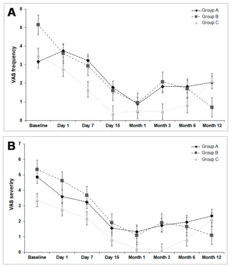 The VAS frequency and severity outcomes showed no significant differences (p >0.05) among the groups at any time of the follow-up time (see Figure 5). The improvement percentage in VAS frequency was 35.5% for group A, 86.2% for group B, and 39.1% for group C. The percentage improvement in VAS severity was 51.8% for group A, 79.5% for group B, and 37.1% for group C. The analysis of the OSDI questionnaire showed no significant differences among the different groups at any time of the study, except for group A and C, among which significant differences (p < 0.05) were observed at months 6 and 12 between both groups (see Table 5).